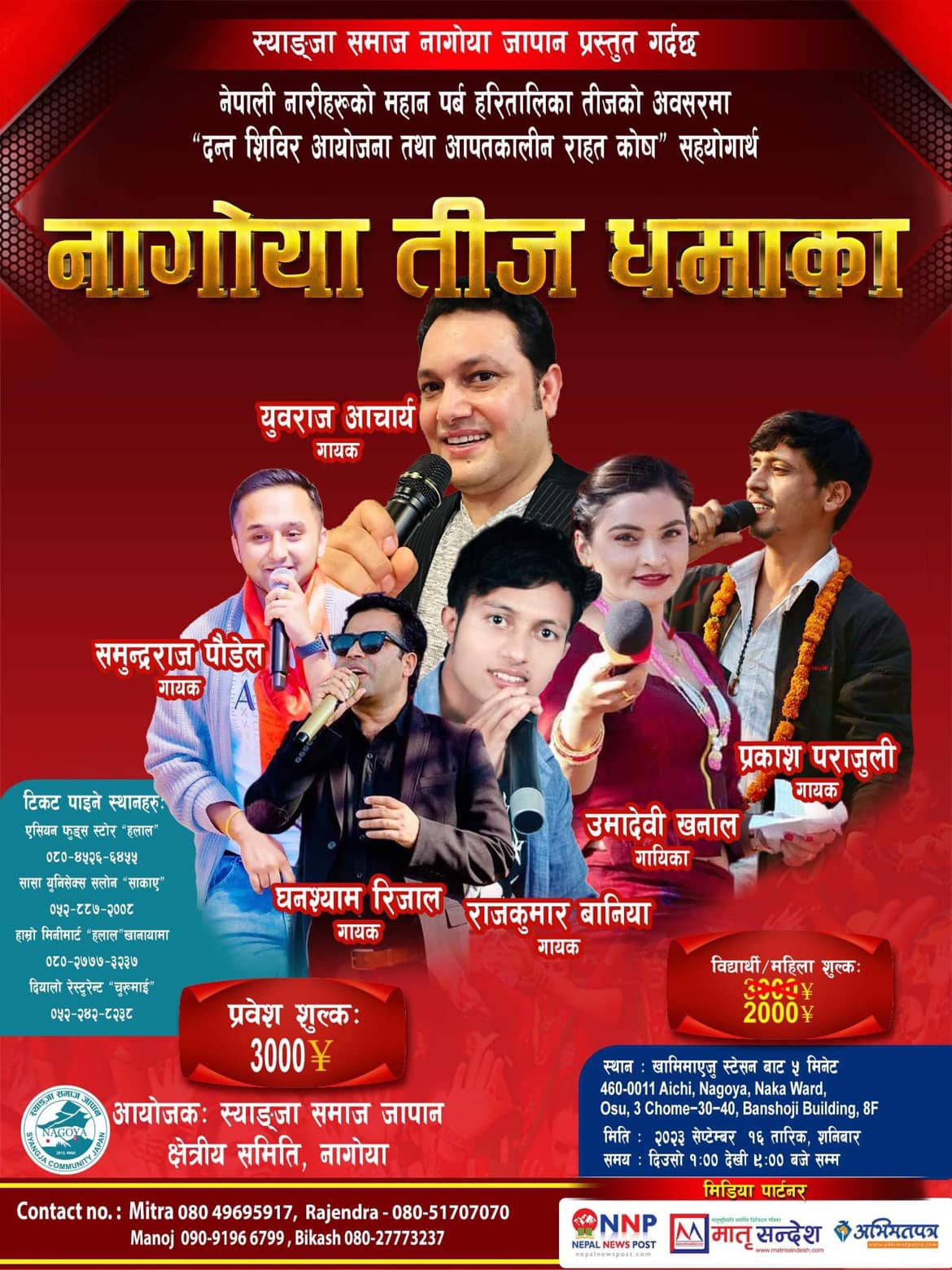 यस बर्ष पनि स्यांगजा समाज जापान र स्यांगजा समाज क्षेत्रिय समिती नागोयाले आयोजना गरेको तिज धमाका कार्यक्रममा यहाहरु सबैजनालाई हार्दिक निमन्त्रणा गर्दछौ
