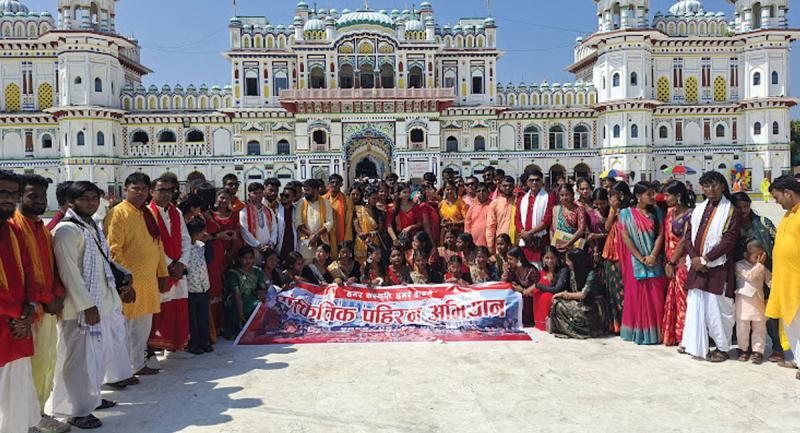 पछिल्लो समय युवाहरूमा मिथिलाको मुख्य पोशाकको रुपमा रहेको धोती कुर्ताप्रति बढ्दै गइरहेको वितृष्णा कम गर्ने उद्देश्यले युवाहरूले जनकपुरधाममा पुरुषले धोर्ती कुर्ता तथा सुल्टो साडी लगाएर निस्किएको हो।