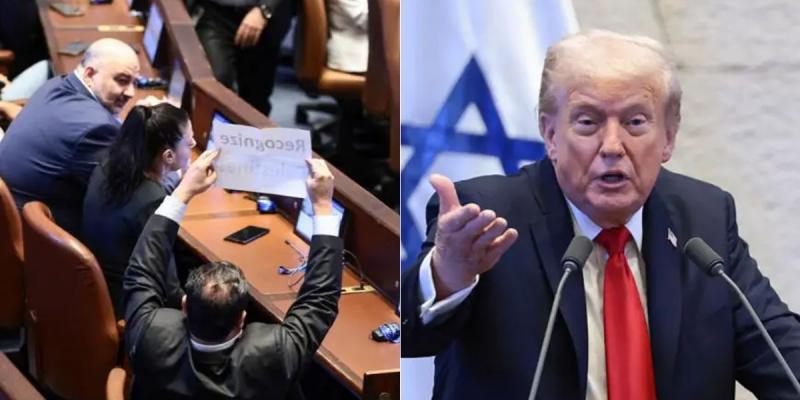 खासमा ट्रम्प बोलिरहँदा इजरायली विपक्षी दलका एक सांसदले एउटा कागज देखाए । जसमा लेखिएको थियो– ‘प्यालेस्टाइनलाई मान्यता देऊ ।’