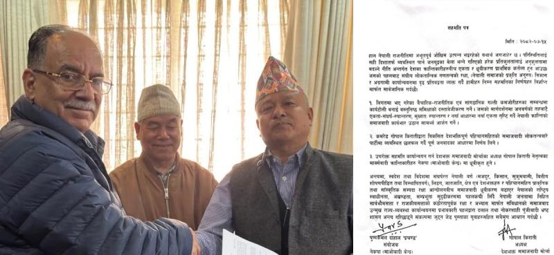 : नेकपा (माओवादी केन्द्र) र देशभक्त समाजवादी मोर्चाबीच एकता अभियान सुरु गर्ने सहमति भएको छ । सहमति पत्रमा नेकपा (माओवादी केन्द्र) का संयोजक पुष्पकमल दाहाल ‘प्रचण्ड’ र देशभक्त समाजवादी मोर्चाका अध्यक्ष गोपाल किरातीले हस्ताक्षर गरेका हुन् ।