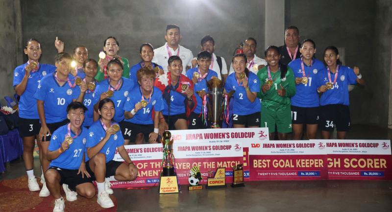 : सशस्त्रको एपीएफलाई स्तब्ध पार्दै नेपाल पुलिस क्लबले प्रथम झापा महिला गोल्डकपको उपाधि उचालेको छ। शिवसताक्षीस्थित दुधे रंगशालामा सोमबार भएको फाइनल खेलमा पुलिस क्लबले एपीएफ फुटबल क्लबलाई १–० गोल अन्तरले पराजित गर्दै उपाधि जितेको हो।
