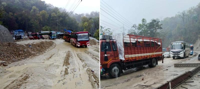 भारी वर्षाका कारण विनयी त्रिवेणी गाउँपालिका २ दाउन्ने बजारस्थित ६४ मोडमा सडक मर्मत भैरहेको स्थानमा सडक हिलो र चिप्लो हुँदा राजमार्ग अवरुद्ध भएको हो ।
