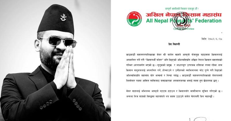 ‘काठमाडौं महानगरपालिकाका मेयर श्री बालेन साहले आफ्नो फेसबुक स्टाटसमा किसानलाई अपमानित गर्ने गरी “किसानझैँ फोहर ” भनि दिइएको अभिव्यत्तिप्रति अखिल नेपाल किसान महासंघको गम्भीर ध्यानाकर्षण भएको छ । मुलुकको प्रमुख र आधारभुत उत्पादक शक्तिका रुपमा रहेका आम किसान समुदायलाई अपमानित गर्ने, होच्याउने र उनीहरुको स्वाभिमानमा चोट पुग्ने गरी दिइएको अभिव्यक्तिप्रति महासंघ घोर भत्सर्ना र निन्दा गर्दछ ।’ विज्ञप्तिमा भनिएको छ, ‘काठमाडौं महानगरपालिकाको मेयरजस्तो जिम्मेबार पदमा आसिन व्यक्तिबाट यसप्रकारका अपमानजनक भनाई व्यक्त हुन खेदजनक छन् । मेयर साहलाई अभिलम्ब आफ्नो स्टाटस हटाउन र किसानसँग माफीमाग्न सूचित गरिएको छ । अन्यथा निज साहको विरुद्धमा महासंघले थप कदम उठाउने समेत चेतावनी दिन चाहन्छौं ।’