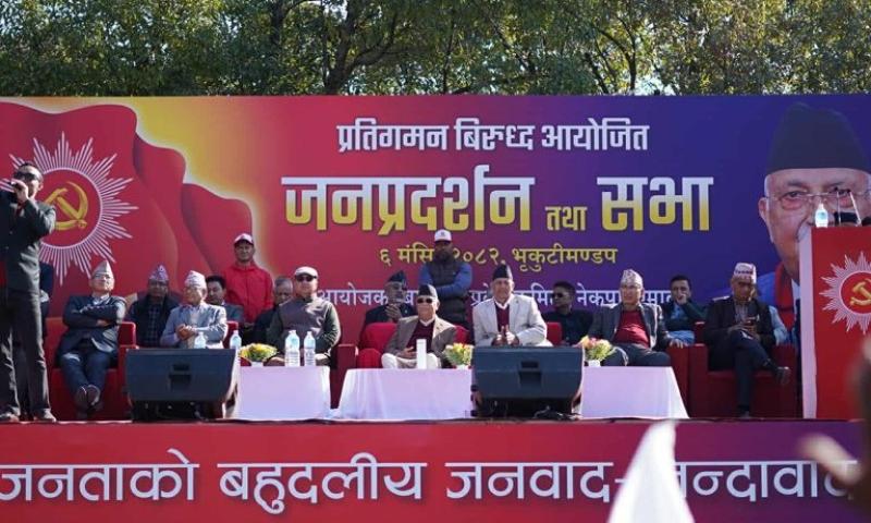 अध्यक्ष ओलीले असंवैधानिक ढङ्गले भंग भएको प्रतिनिधि सभाको अविलम्ब पुनर्स्थापना हुनुपर्ने बताए। उनले भने,ʻहुन्छ पनि अब अर्को बाटो छैन। त्यही बाटोबाट देश अगाडि बढ्छ।ʼ