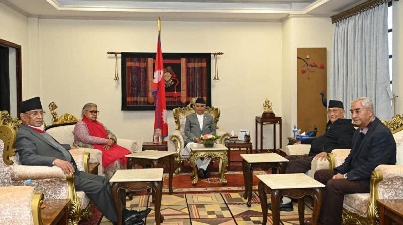 प्रधानमन्त्री र तीन दलका शीर्ष नेताको राष्ट्रपतिको छलफलपश्चात प्रधानमन्त्री बाहिरिएकी थिइन्। त्यसपश्चात शीर्ष नेता र राष्ट्रपति पौडेलबिच छुट्टै छलफल भएको छ।